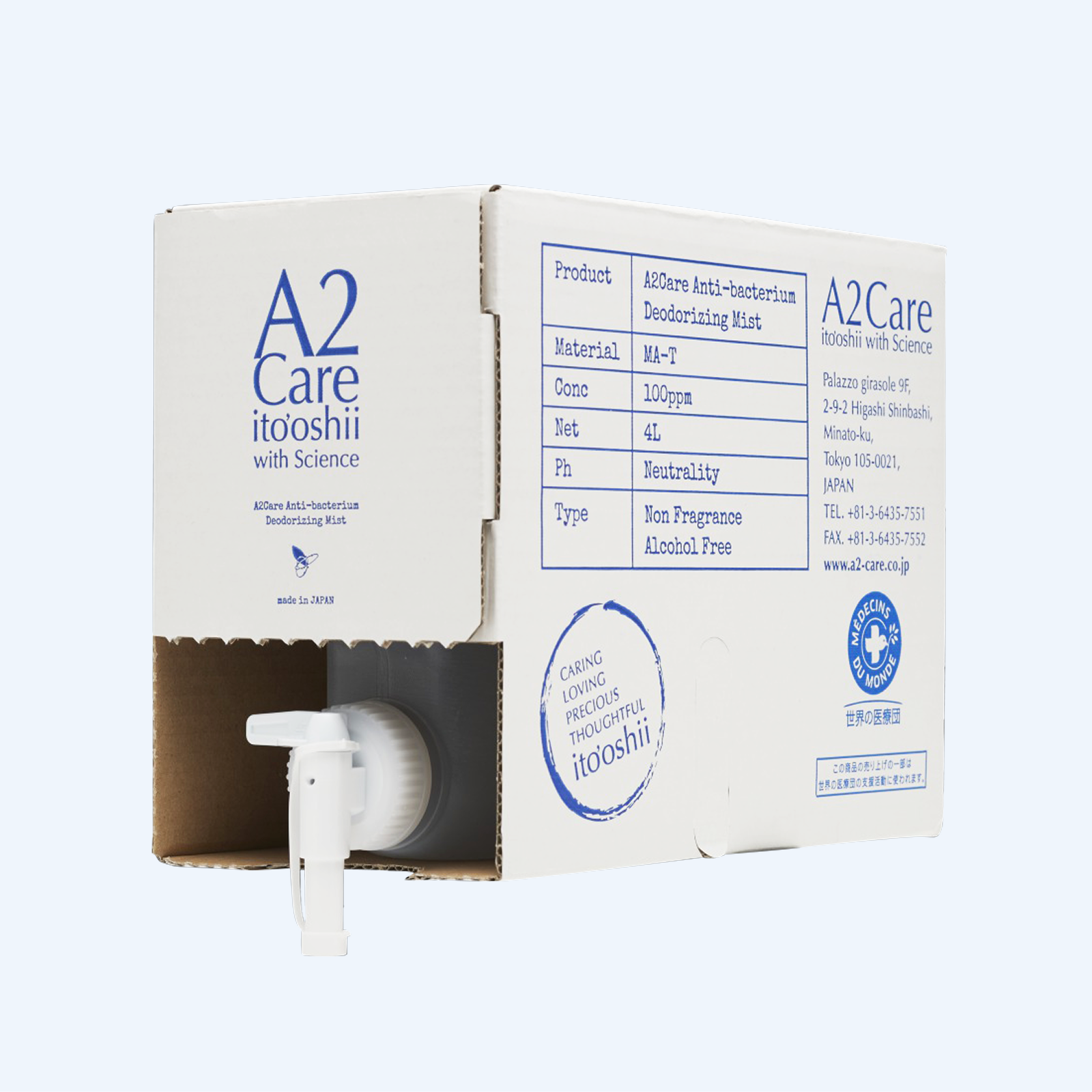 A2Careは、成分の99.99%が精製水という圧倒的な安全性と、大阪大学の技術をベースにした「MA-T system」の確かな効果を両立した、次世代の除菌消臭剤です。